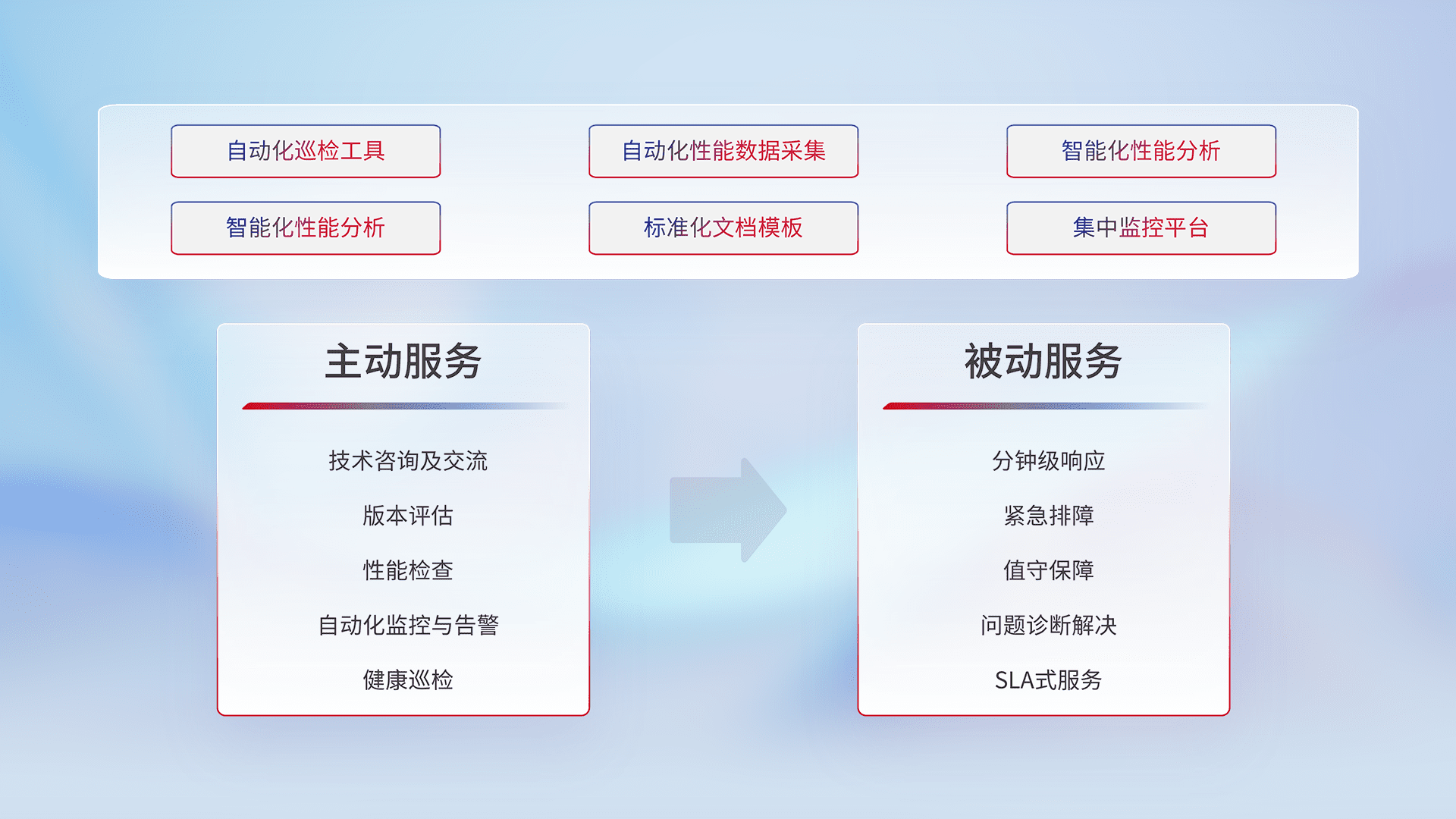 智能化工具和标准化文档,,,,保障服务质量,,提供主动服务(包含技术咨询、、版本评估、、、、性能检查、、、自动化监控与告警、、健康巡检)和被动服务包含(分钟级响应、、紧急排障、、、、值守保障、、、问题诊断解决、、、、SLA服务)。。